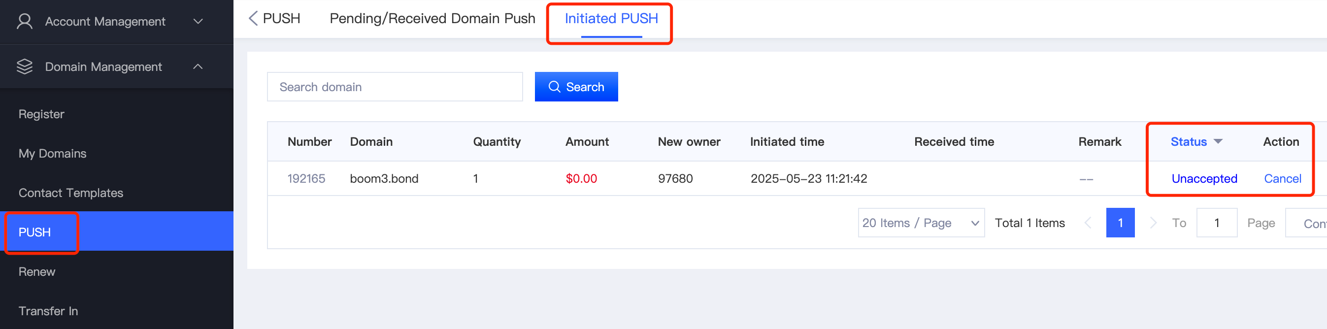 1).Once the PUSH request is accepted by the other party, the domain will no longer belong to you. Please double-check the recipient’s account ID carefully.